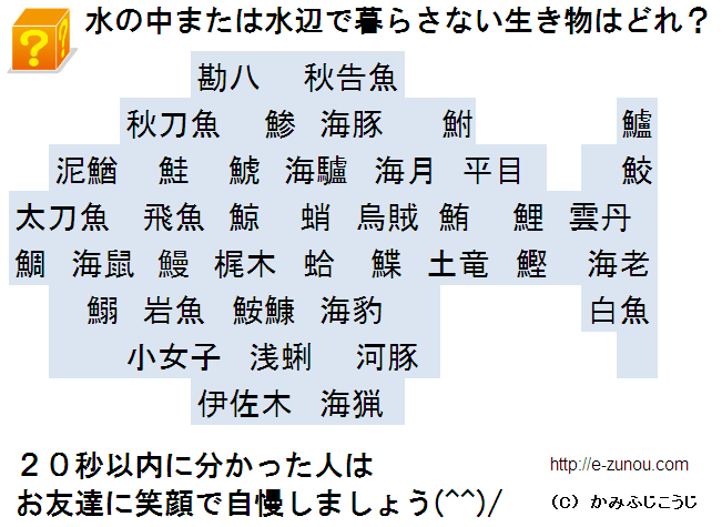 漢字クイズ 水の中または水辺で暮らさない生き物は